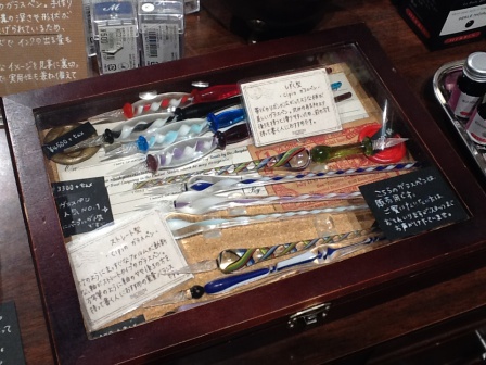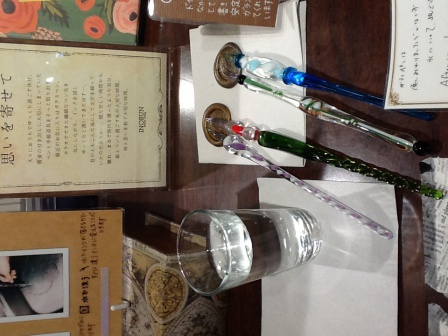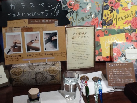 ガラスペンを自由に手に取れるようになっておりますので、気軽に試し書きをしていただけます。