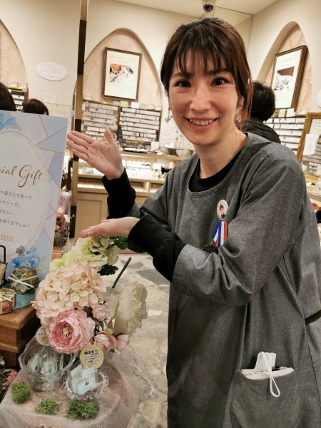 大野:実は、最初から特にイメージをすごく固めてやったというわけではないんですが、入って来られるお客様の目につくようにと、色合いですとか季節的なもの、あとはあまり商品が埋もれず映えるように、とかですね。可愛らしすぎてもちょっと……という感じなので、今までの先輩たちが作ってきた売り場なども参考にしながら、お花ひとつ置くにしても、こっちにこう置いたらどういう印象になる、とかいうのを他の人にもアドバイスもらいながら。季節の明るさと言いますか、こういうご時勢なので、少しでも明るく華やかに、でも派手すぎず、ということを意識してやりました。