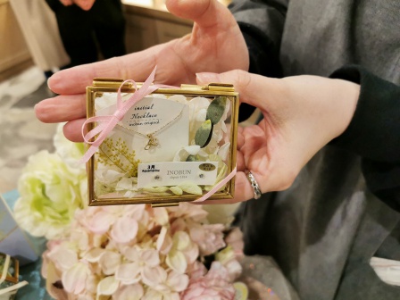 大野:プレゼントを開けたときの「あー可愛い!」っていう喜びって大事だと思うので、もちろん貰って嬉しいっていうのはあるんですが、ラッピングもやっぱり喜びになると思うんですよ。なので、今回の特集のようにガラスケースにお花を入れたようなラッピングですとか、他にイノブンでご用意しているアクセサリー用のBOXなども上品さがあったりするので。アクセサリーを選ぶだけではなくて、貰う方を想像したり、開けたときの可愛い!っていう喜びを一緒にご提案させて頂いております。買いに来てくださった方にも楽しみのひとつとしていただければ嬉しいなと思います。