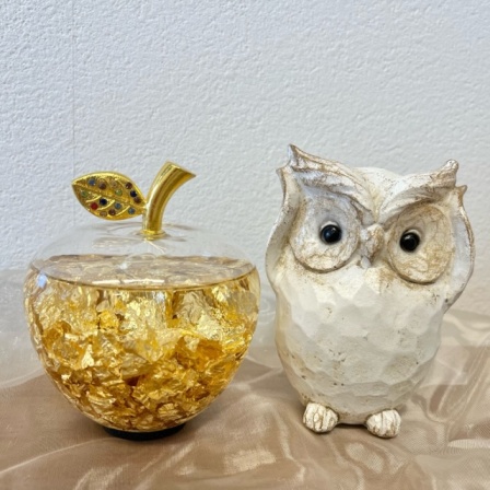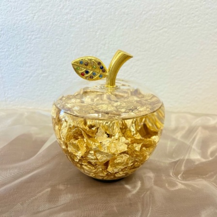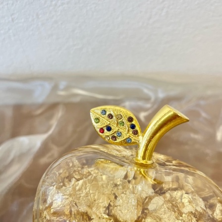 フェイク金箔がたっぷり入った、ガラス製のりんご。金色のパラフィンがオイルにゆらゆら揺らめく様子は、ずっと見ていられるほどの美しさです…!