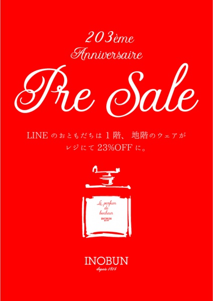 今回は203周年ということで、メール会員さま、LINEのお友達は1階、地階のウェアがレジにて23%OFFに(メール、LINEのご登録のない方は10%OFFとなります)。