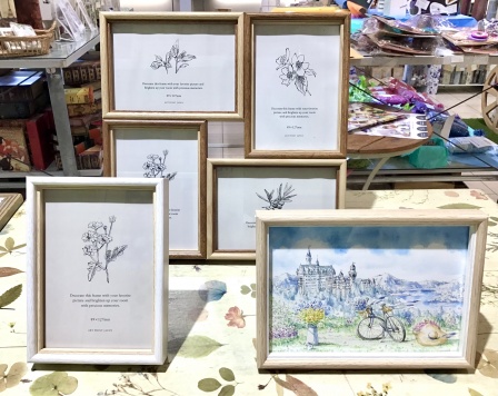 爽やかな内田さんの作品には、木枠のナチュラルフレームやカラーフレームがとてもよくあいます。