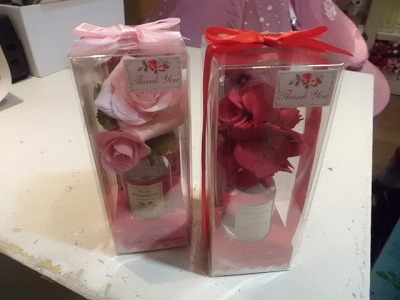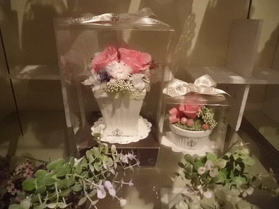 こちらは長期保存のできるブリザーブドフラワーのフラワーギフトです。色も可愛らしく温かみのあるピンクを揃えております。