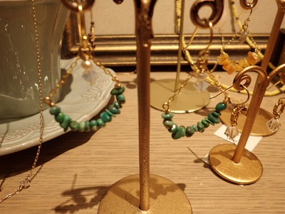 6・7つ目…上がターコイズ、下がジェイドという天然石を連ねたピアス。