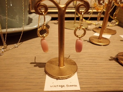 5つ目…ヴィンテージフランスのピンクの石と、模様のあるゴールドのパーツを組み合わせたピアス。