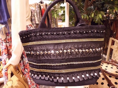 この商品、とても人気です。キャンパス生地のトートバッグに様々な種類のビーズがあしらわれた大人っぽいバッグです。