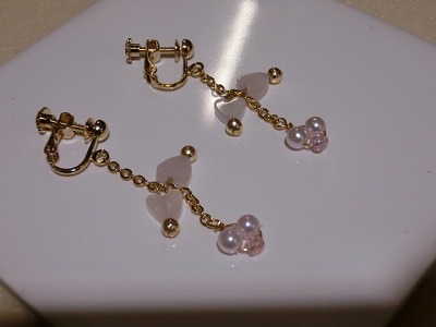 ハートの天然石と、ピンク色のパールが揺れる女の子らしいイヤリング