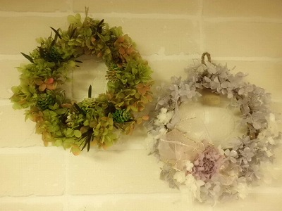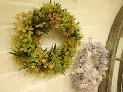 さわやかなグリーンのリースとやわらかな紫の可憐なリース*