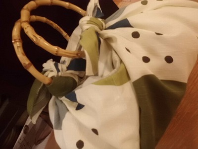 物を包むだけではなく、こちらのハンドルをつけていただくとバックとして楽しむことができます。
