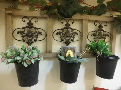 アンティークな木枠の中にアイアン模様のこちらの壁掛けハンギング、造花や植物はもちろん、