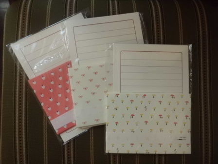 kakikakiレター:¥504 素朴な小さい絵柄がたくさん並んでいて、便箋の赤い罫線がどこかレトロな雰囲気を漂わせています。定番で人気のいちご、りぼん柄に、秋限定できのこ柄も仲間入り。たっぷり書ける便箋で、名前の通りkakikakiしたくなるようなレターです。
