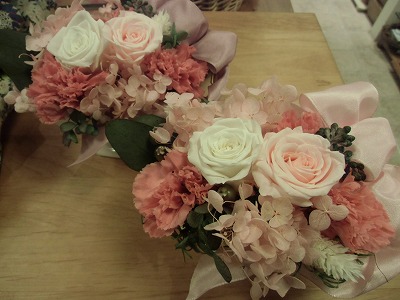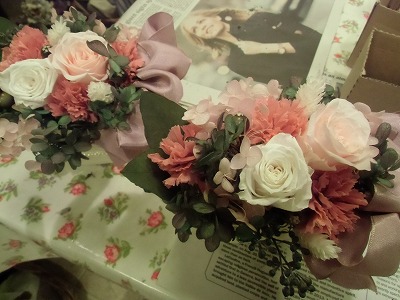今回は春らしい色合いのプリザーブドフラワーと木の実、リボンなどを使って