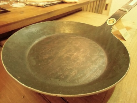 鉄の塊から高温何度も叩いて、加熱を繰り返して作られたフライパンで、