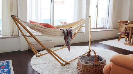 お部屋によく馴染む美しい木目調のスタンドがポイントのハンモック。(18500円+tax)