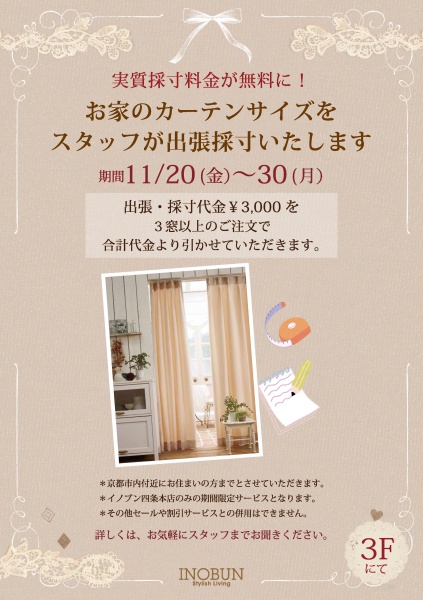 11月20(金)~11月30日(月)まで、3窓以上のご注文でオーダーカーテンの出張採寸が実質無料になるキャンペーンも実施中です。