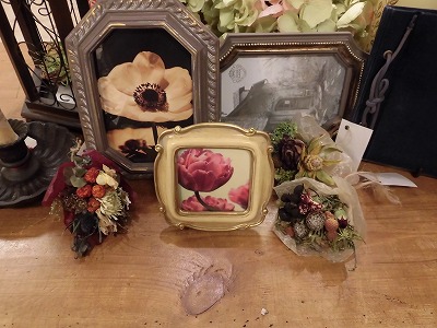 この様に色々なサイズのフレームと、ドライフラワーやキャンドルと一緒に飾ると素敵なディスプレイコーナーが出来上がります。