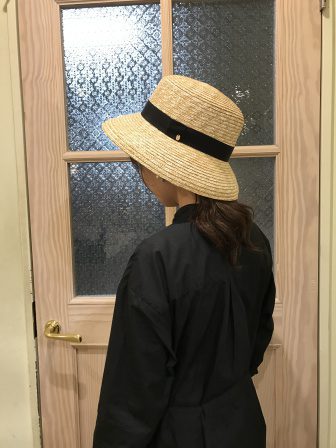 つばが狭いこちらは、上品な雰囲気で、襟が付いているトップスや