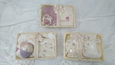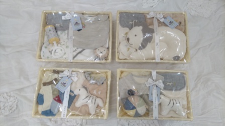 こちらの3つのシリーズは、スタイ・ガラガラ…等々、単品でも置いております。その中でお客様の好みに合わせてギフトを組んでもらうこともできます♪