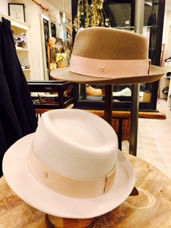 他には中々見ない、とてもとても綺麗なお上品色の中折れ帽子です。後ろにリボンのポイントが少し。後はシンプルなデザインです。画像では伝わらないこの色目、ペールベージュというんでしょうか、と、ブラウンという言葉が野暮ったくなる、もっと、何て言ったらいいんでしょう……ブラウン…。