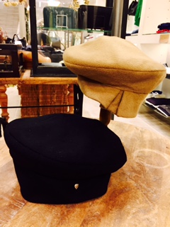 少し変わった形のベレー?帽子。画像では分かりにくいかもしれませんが、黒い帽子は左向きです。左にチャームがきて、右に少しデザインが、ベージュは左向きです。