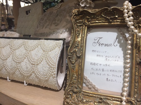 一階奥ではそんなブライダルシーズンに欠かせないドレスや小物をご用意致しております!