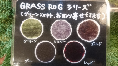 こちら、店内にディスプレイされているものですが、この机の下に引いてある、緑の芝生のようなラグが、グラスラグです。