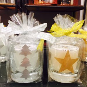 ツリーと星の柄のグラスに入っているキャンドです。さりげなく部屋に飾ってください。
