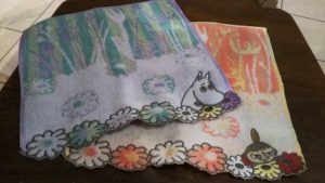かわいいお花のミニタオル。お花からミイとムーミンが顔をだしています。