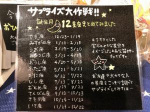 担当スタッフが星座早見表を書いてくれているので、誕生日は知ってるけど何座だっけ?となった時に是非ご活用下さい!