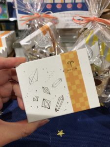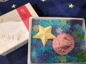 小さな箱の中に12星座をデザインした和三盆と、夜空に見立てた青い金平糖が敷き詰められています。