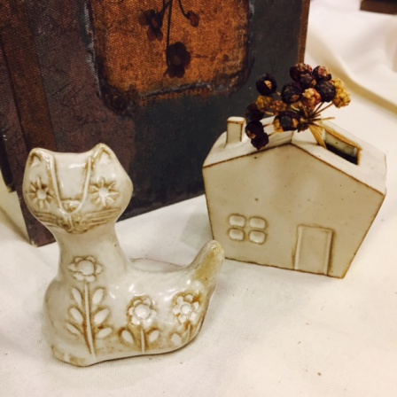 猫ちゃんはオブジェです。目が星のように光ってますキラリーン☆家の形の花器は本当に小さな物。手のひらサイズなので花をいけるというよりは、道端で咲いていた花を1、2本拝借しまして、ぷすりと挿しておくのが似合いそうです。