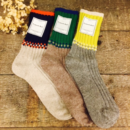 その他にもフレンチブルの靴下がたくさんあります。憂鬱な時季をカラフルとちょっと良いもので乗り切っていきましょう!