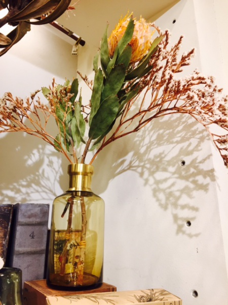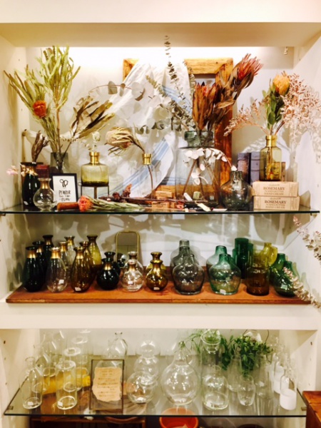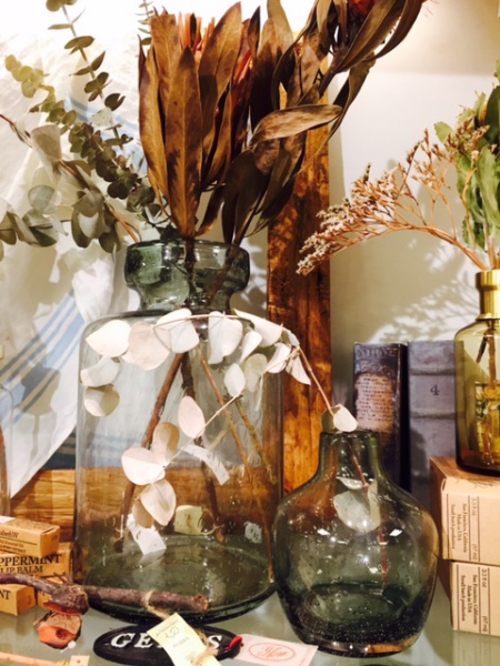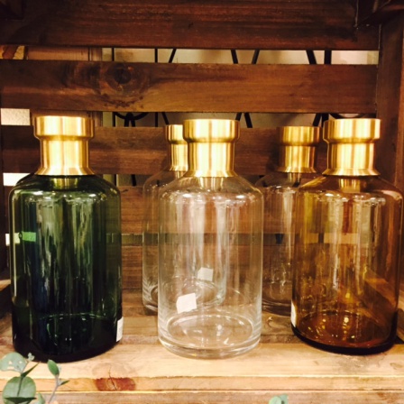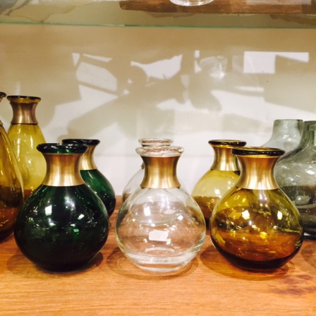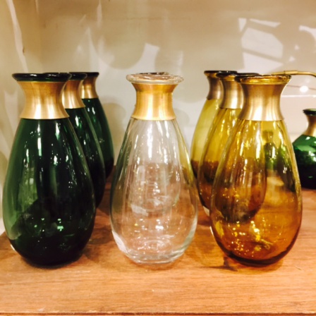地下フロアに入荷してきましたフラワーベース、ガラスに真鍮のアクセントがあり、色がついているものもあり、夏らしい、素敵です!