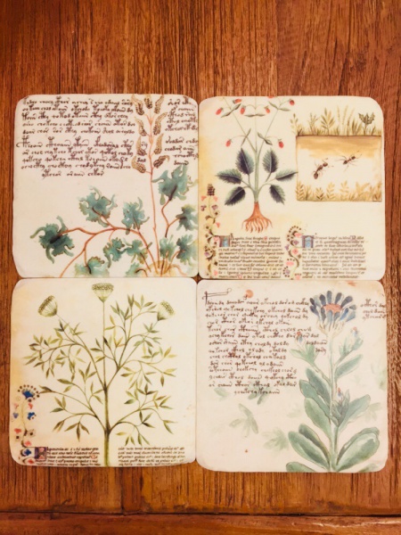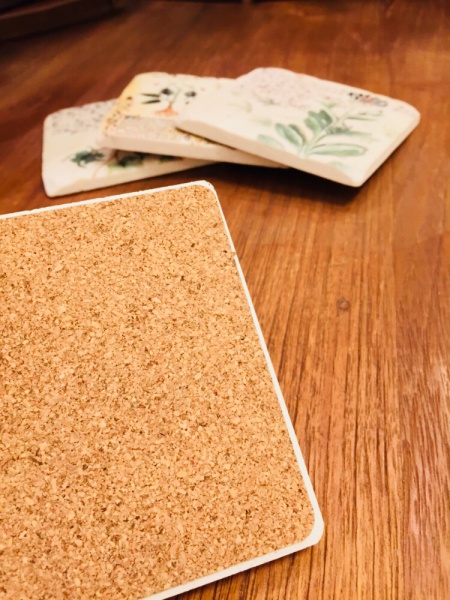 レジン素材と裏はコルクになっているのですべりにくいです。水彩画のような絵が柔らかい雰囲気で、並べて置いてタイルのようにしても可愛いですね。
