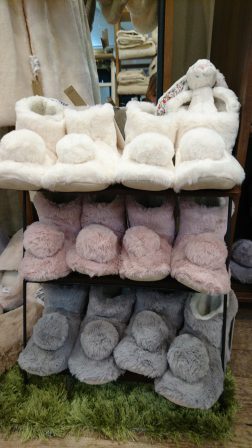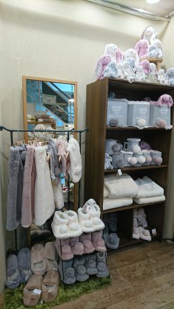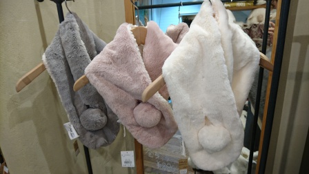 もこもこふわふわの中から見え隠れしているうさぎのぬいぐるみたちが可愛いこちらの売り場からです。