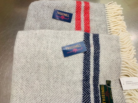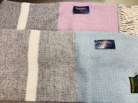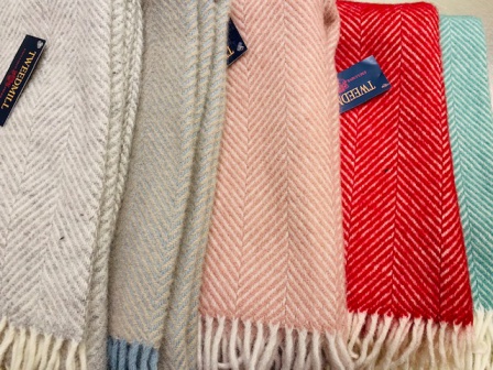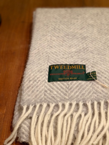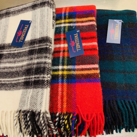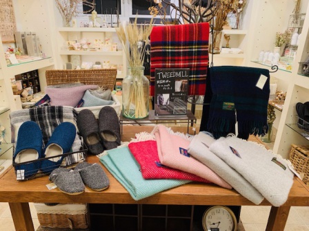 スコットランドで採れた新鮮なニューピュアウール(羊毛)を自社工場で、一括管理、加工していて、その優しい肌触りが特長です。良質で軽量な毛糸が使われているので、家だけでなくアウトドアで愛用している人もいるそうですよ(ラグ用のもので、当店では取扱はございませんが…)
