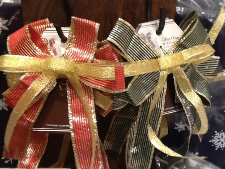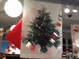 壁に飾るクリスマスツリー。オーナメントやリボンを安全ピンなどで飾りつけて。