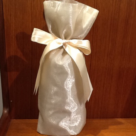 華やかなシャンパンゴールドのボトル巾着ギフトバッグ。甘い物の代わりにお酒のプレゼント。