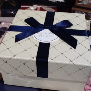 ゴールドの箔押し模様とサテンリボンが上品。ケーキや焼き菓子と可愛くコーディネートして、とっておきの一箱に。