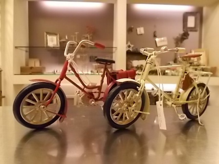 自転車です。赤い自転車は見にくいですが、鞄がついています。郵便屋さんが乗っていた自転車みたい。