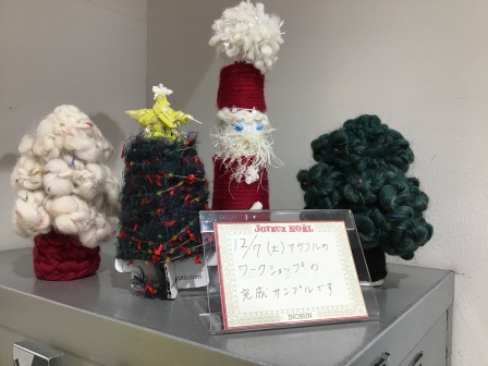 クリスマスの贈り物にオススメなゆび編みで作るネックウォーマーと、とんがり帽子、かぎ編みで作る小さなもみの木。そして、お子様でもお作りいただけるクリスマスペラコーンで作るサンタとツリー。専門スタッフによるワークショップですので、この機会にぜひご参加下さい。