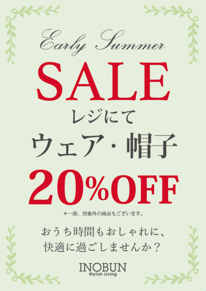 5月18日(月)の営業再開日より、5月31日(日)までの期間限定で、お洋服と帽子がレジにて20%オフになります。