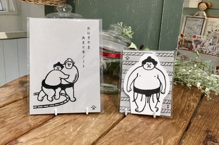 続いてはこちら、「おはぎやま決まり手ノート」&「おはぎやまメモパッド」です。おはぎやまと外国人力士の取組のイラストから、相撲の決まり手を学べるおはぎやま決まり手ノート。ゆるカワなイラストは見ているだけで癒されます。お腹の部分がメモになっているおはぎやまメモパッド。こちらは抜群の存在感を誇り、デスクの上に飾っておくだけで癒されること間違いなしです。