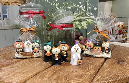 まずはこちら 仮装猫達です。定番のお化け、ドラキュラ、魔法使いにカボチャを着たネコやカボチャ頭ネコそして動くカボチャハロウィン感満載のネコ(?)達です。デスクの上や玄関など置くだけで気軽にハロウィン気分を楽しめます。奥に見えているようにセットでのラッピングもうけたまっております。