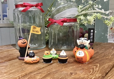 続いてはこちら。かぼ太郎とお菓子な仲間達です。カボチャから生まれたかぼ太郎。鬼ではなく悪霊を退治に行きます。そしてお供のお菓子達。悪霊に見えなくもない(?)仲間達ですが可愛いのでオッケーです!そして左端に見えるのがカボチャ頭。ハッピーハロウィンの旗を掲げてハロウィン気分を盛り上げてくれます。