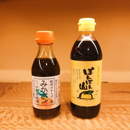 左の 紀州みかんポン酢 みかポン は、まろやかな酸味のみかんのポン酢。