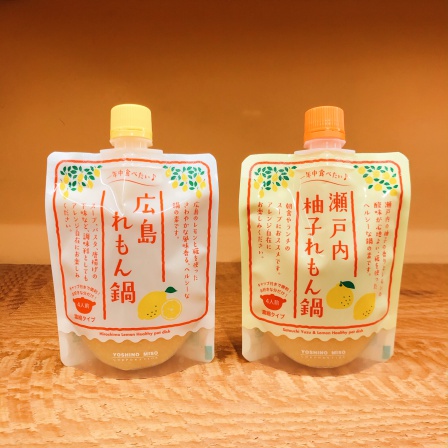 野菜も美味しくたっぷり食べられるのが嬉しいポイント。 女性にも大人気な鍋のもとです。左の広島れもん鍋は、塩麹のやさしい甘みと旨みに、広島れもんのさわやかさと塩がプラスされています。 右の瀬戸内柚子れもん鍋は、柚子とれもんの良いとこ取りで酸っぱ美味しく、より爽やかに頂けます。