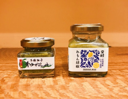 左の青ゆずこしょうは、木頭青ゆずと宮崎県産唐辛子が入った、ピリッと辛い薬味です。右の発酵れもん胡椒は、広島産れもんに九州産青唐辛子で仕込んだ爽やか+辛さ+旨みが絶妙な美味しさ。