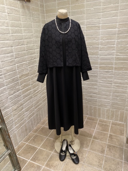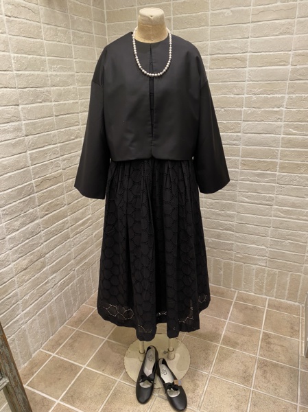こちらは、ワンピースにサークルレースが使用され、ジャケットが光沢のあるお素材になっています。ウエストの切り替え位置やタックをふんだんに使うことでふんわりしたバランスの良いシルエットになっています。