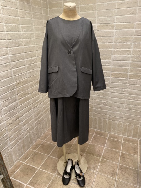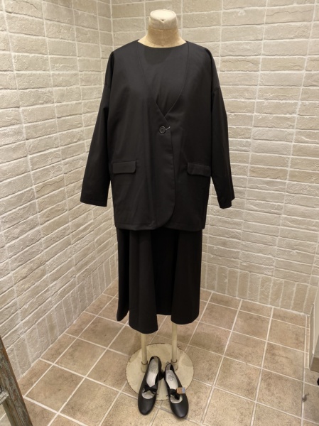 先ほどとは違い、シンプルなフォーマルウエアになります。vネックのジャケットは光沢があり、きちとした印象ですが、少しゆったりとしたサイズ感なので大人の抜け感があります。こちらジャケットとワンピースが別売りで、ブラックもございます。